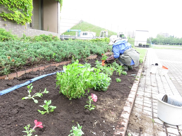 あいにくの天気でしたが、手付かずの花壇に苗を植えました。
