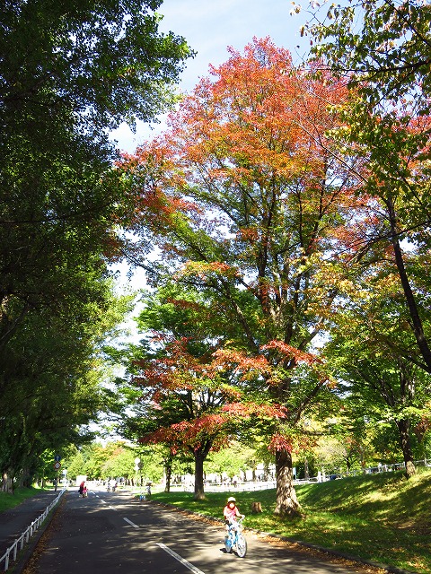 秋が深まるにつれ、紅葉によって鮮やかに彩られる農試公園の風景。