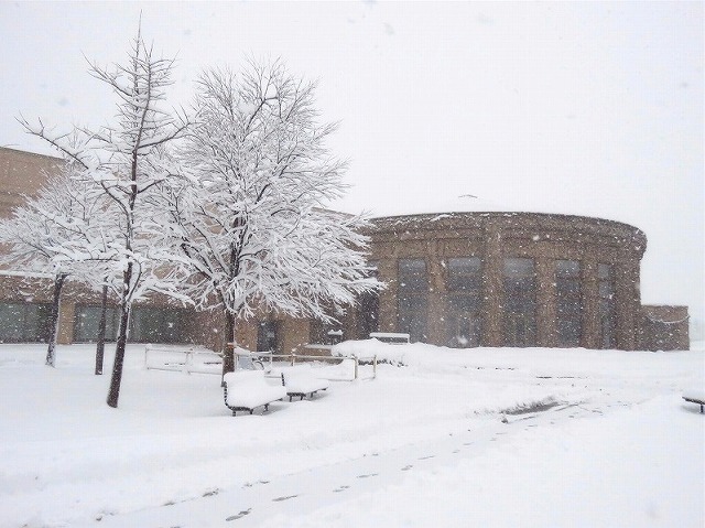 本日は朝から雪が降り積もり、公園の風景は一面真っ白に様変わりしました。