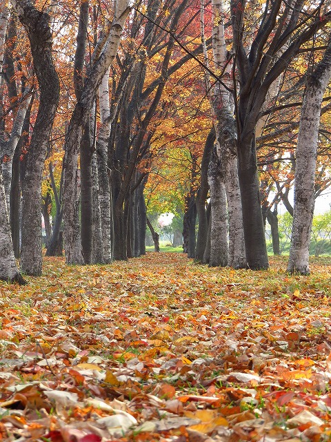 ①頭上にも足元にも紅葉!秋色に囲まれながら、シラカバ並木の間を散歩出来ます。