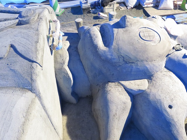 ガリバーの青色のズボンを数人がかりで塗り上げていきます。