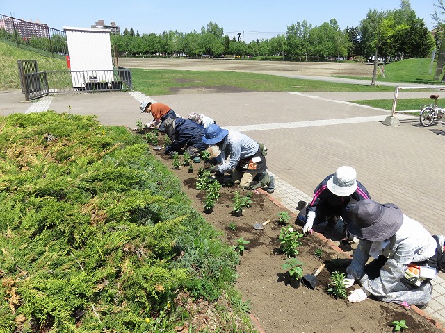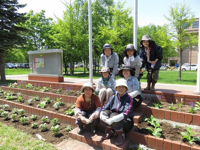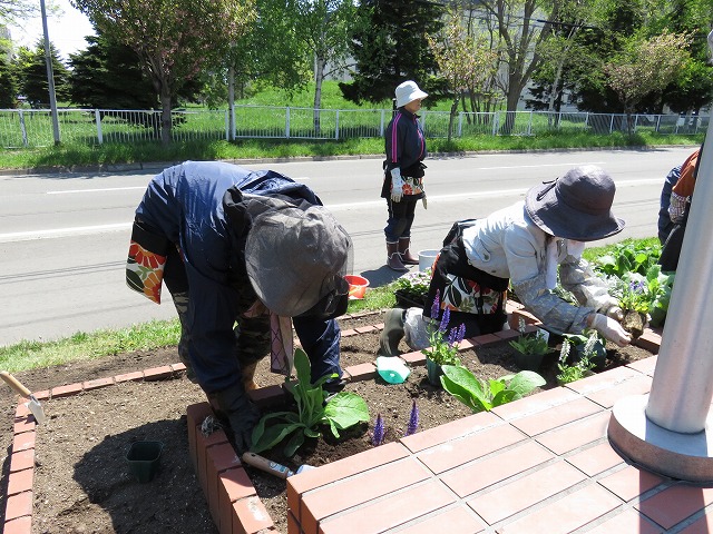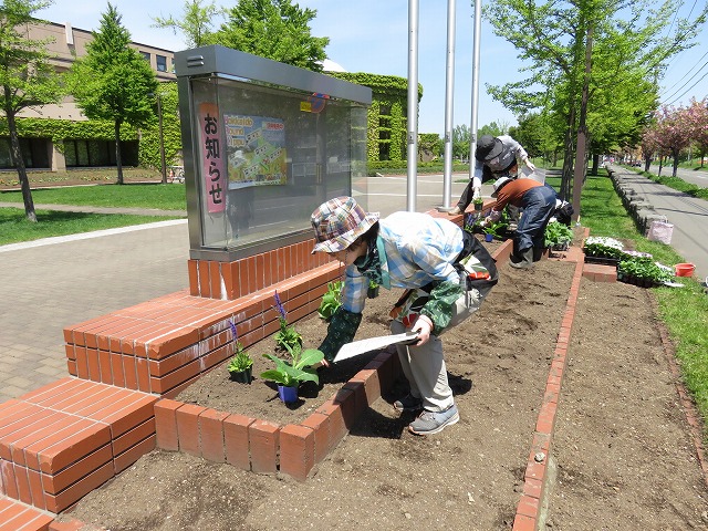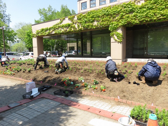 そんな中、5/21(月)にツインキャップ前花壇や農試1号線沿い花壇に花苗の植え込みなどを行いました。