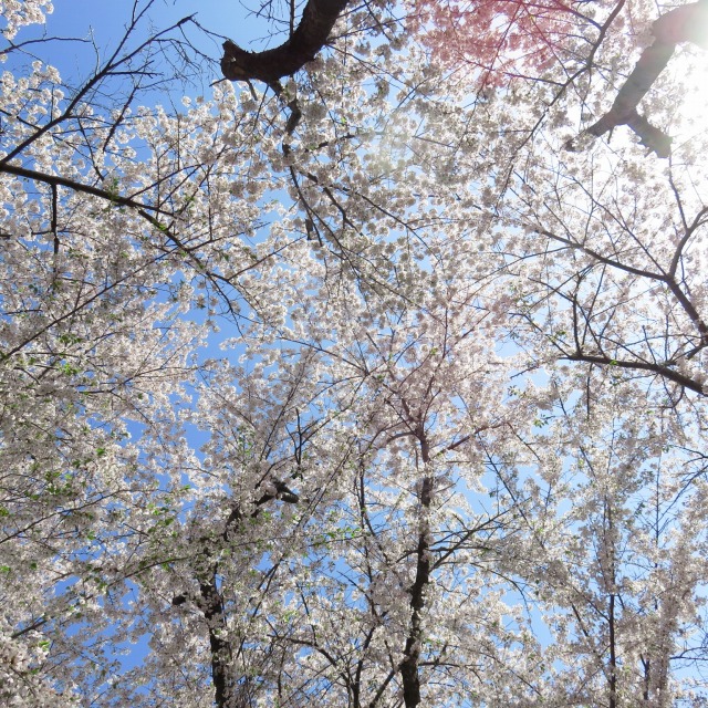 雨を無事乗り切り、現在見頃です!青空に手を伸ばすように桜色に染まった枝が伸びています。