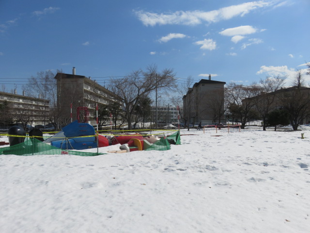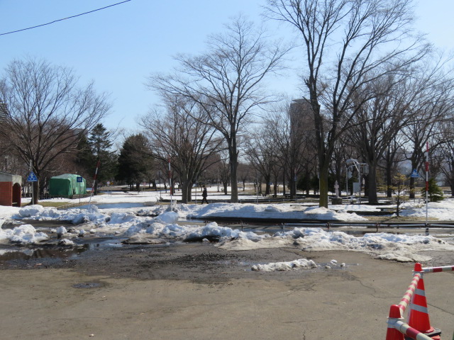 雪どけが進んでいますが、農試公園内はまだたくさんの積雪があり、