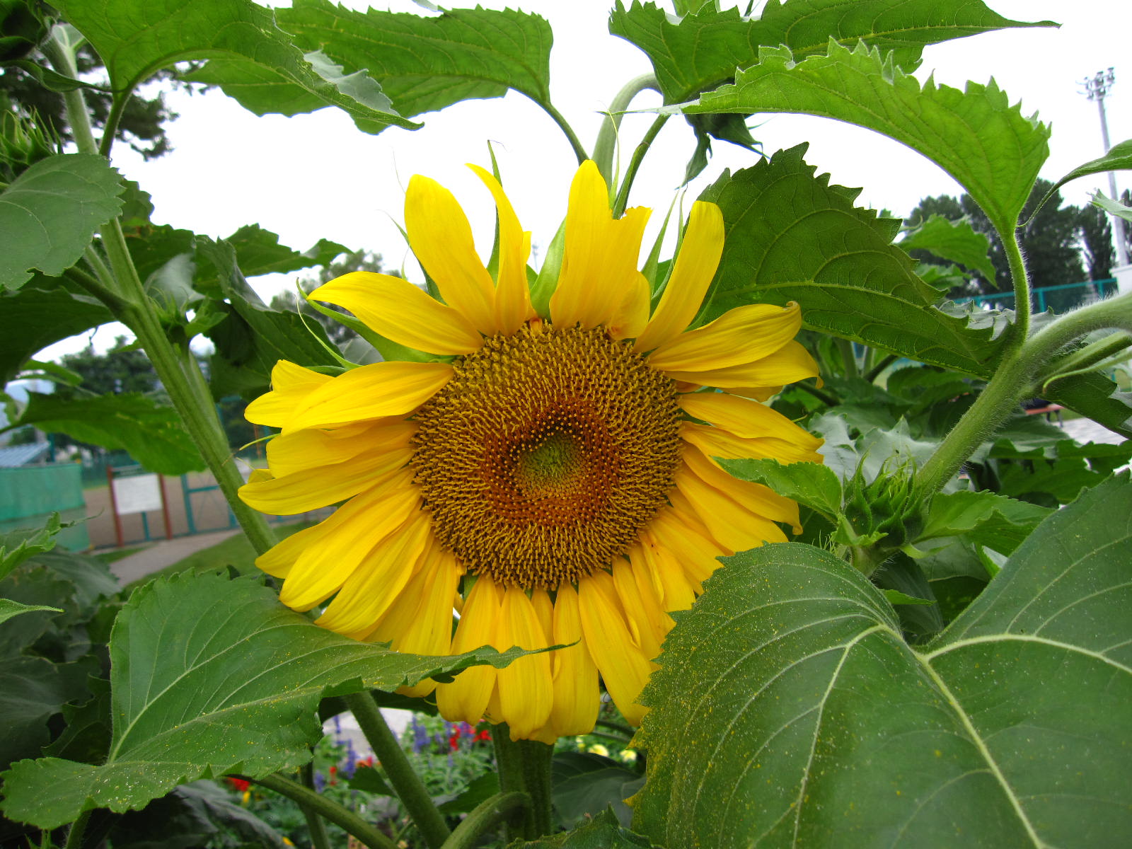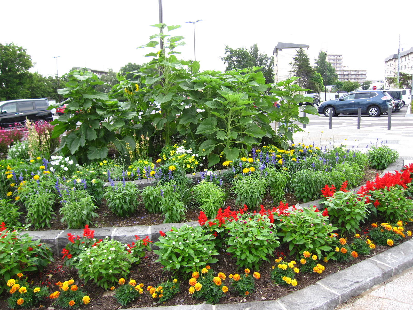 駐車場の花壇に植えたミニひまわりが、巨大に成長しています。