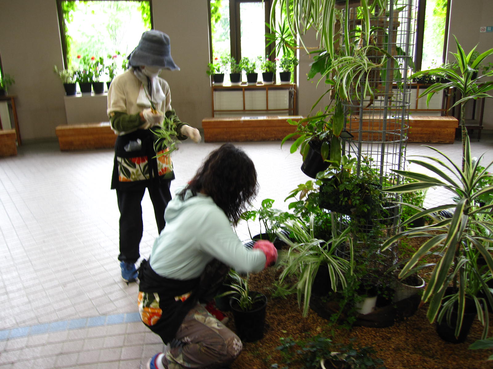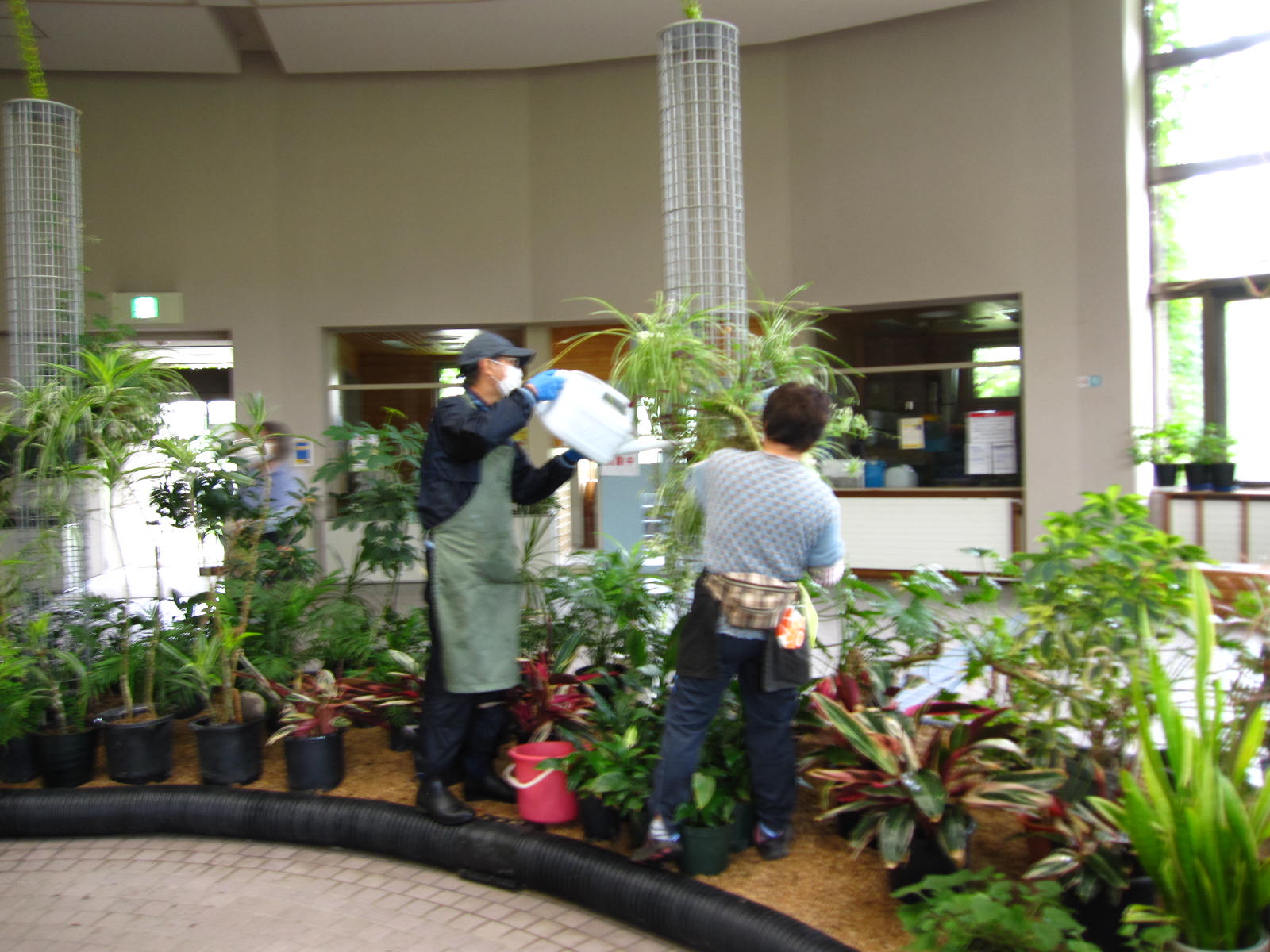 強い雨が降りだしたので、屋内広場サンルームのお手入れを中心に行いました。