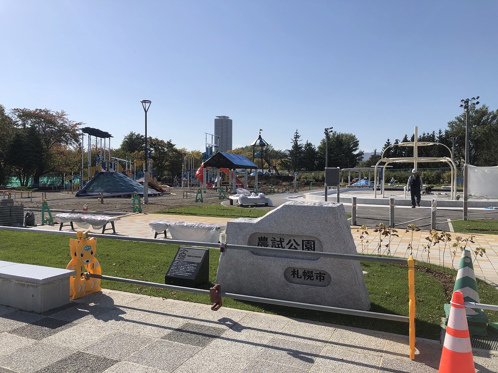 快晴かと思ったら突然雨が降り出すなど、ある意味秋らしい日がづづきますが本日は空も高い快晴日、農試公園の工事も順調に進んでおります。