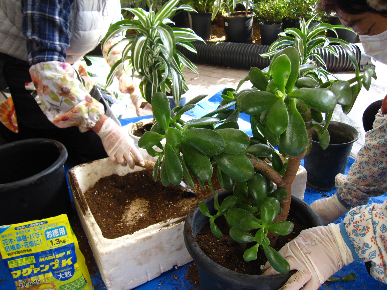 鉢が小さくて、倒れてしまう金のなる木を植え替えました。