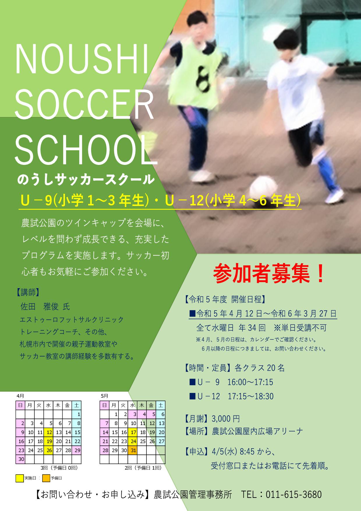 農試公園では、令和8年度も初心者から経験者まで楽しめる「のうしサッカースクール」を開催します。