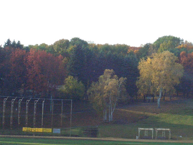 今日で10月も終わりですが、紅葉はまだ楽しめそうです。 しだれ桜の葉にも色が付き始めました。 やっと色の変わり始めたイチョウもありますが、 すでに落ちてしまった葉も絨毯のようになっていてきれいです。 球場の山も美しい眺めが楽しめます。