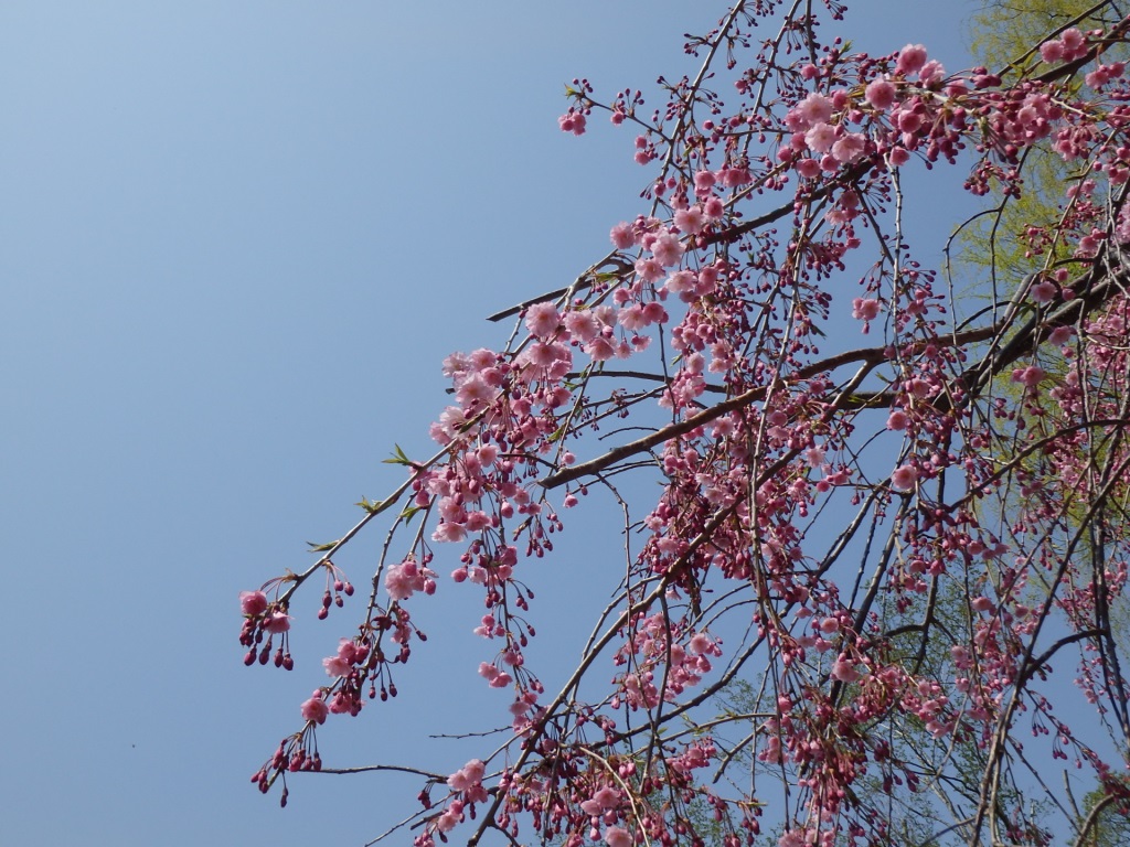 それに取って代わるように、近くのシダレザクラのピンクが濃くなってきています。