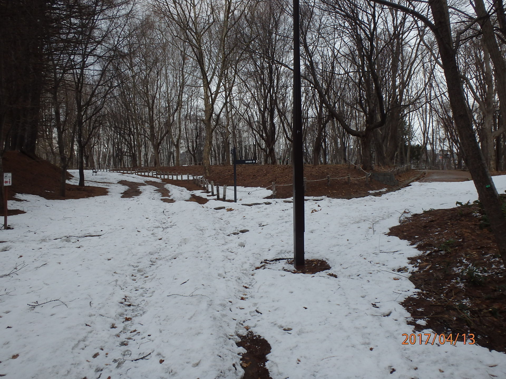 高台駐車場からパークライフセンターまでの園路は、写真の通り、まだ雪が残り