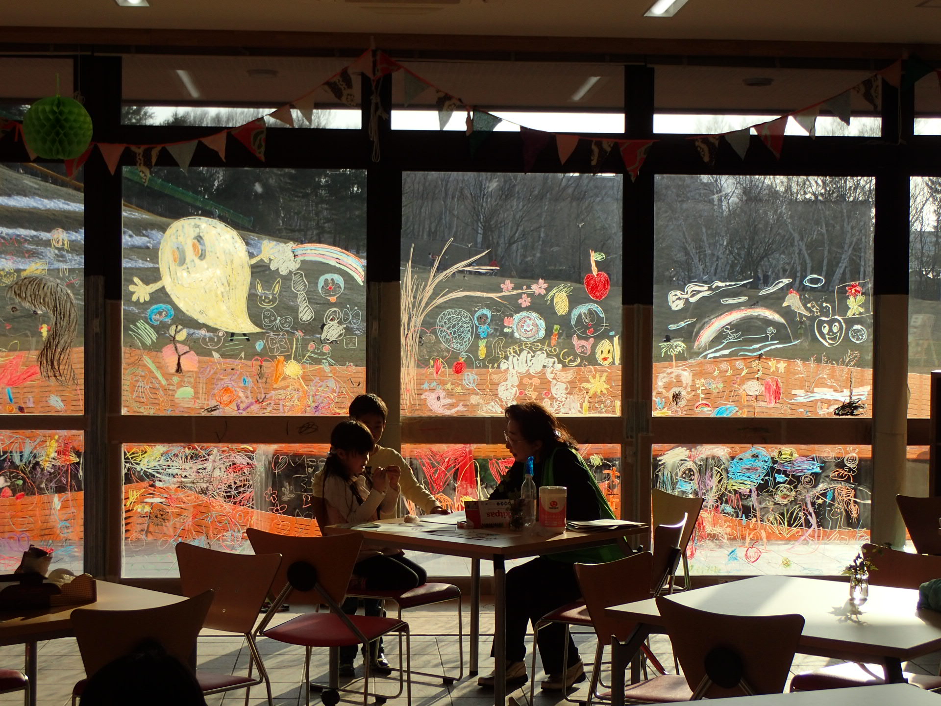 多目的広場を望む窓には、みんなで一面にお絵かきをしました!
