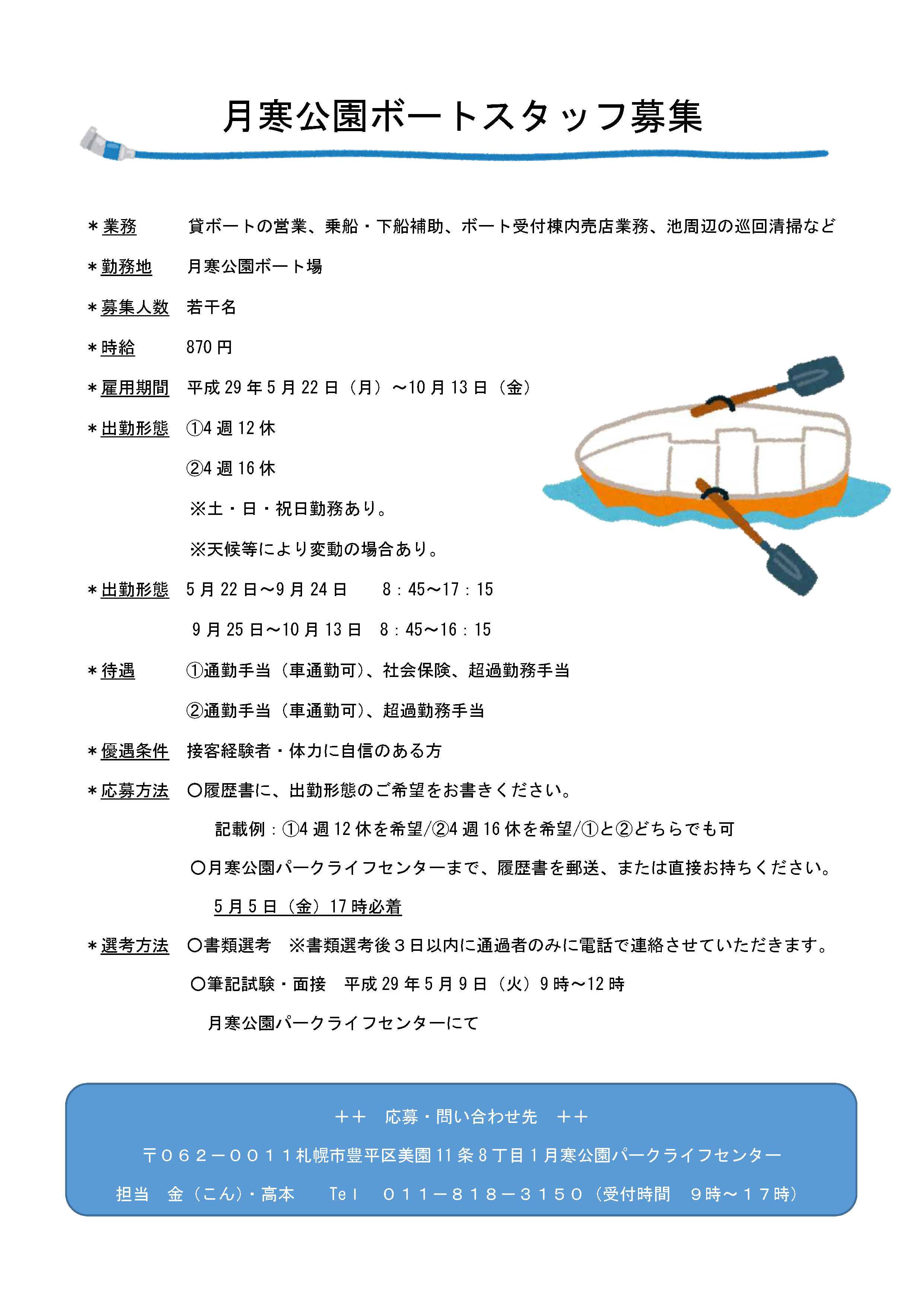 それに伴い、月寒公園では、ボート池で働くスタッフを募集しています。