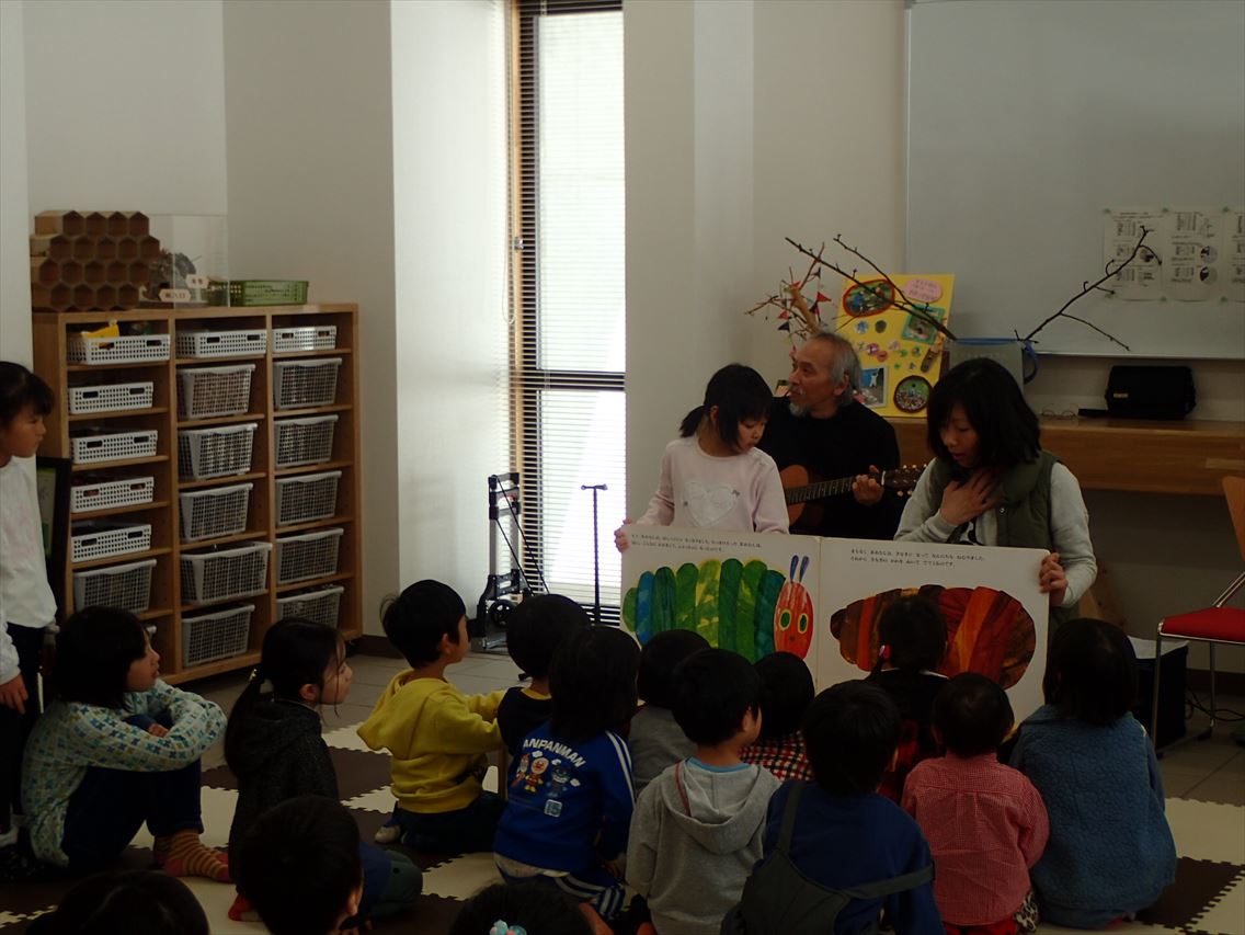 ギターに合わせて「へんしんトンネル」「はらぺこあおむし」など4冊の絵本を読んでくれました。はらぺこあおむしでは、オリジナルの曲に合わせて絵本を読んでくれました。ゆうみつの奏でるメロディは楽しくて、声がハモると心が温かくなりました。