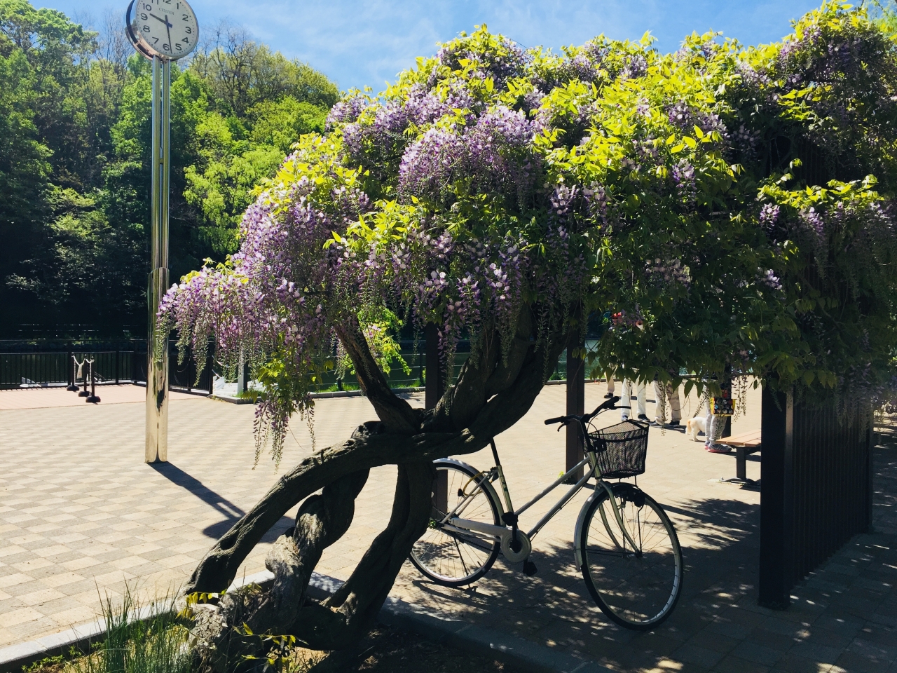 藤の美しい紫色の房が下がる様は優雅さと美しさを感じさせます。