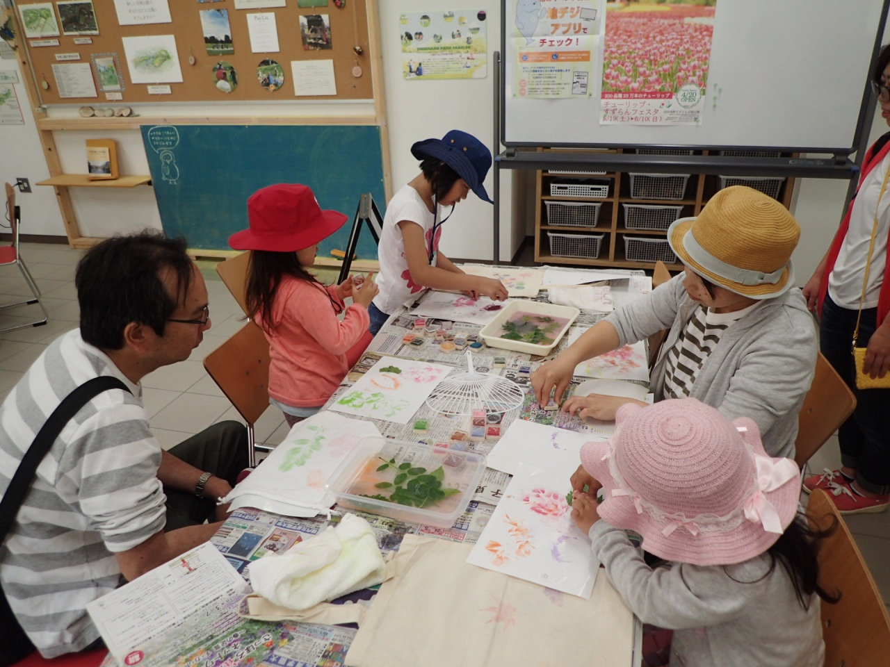 公園の木の葉にいろいろなスタンプを付け、ペンで絵をかき素敵なうちわを一緒に作りましょう!