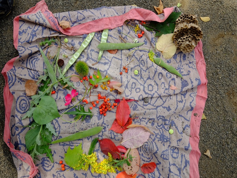 みんな、お気に入りの葉っぱやお花や木の実を見つけて自分のバッグにつめこんでいきます。