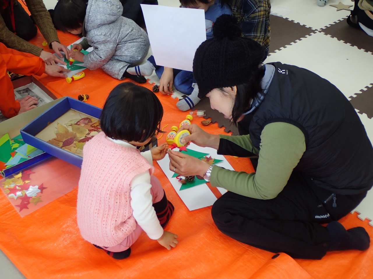 今回の活動は公園のお散歩と絵本の読み聞かせ、そして、木の実を使ってクリスマスの飾りを作りました。たくさんの親子に参加してもらい、元気溢れる一日を過ごしました。