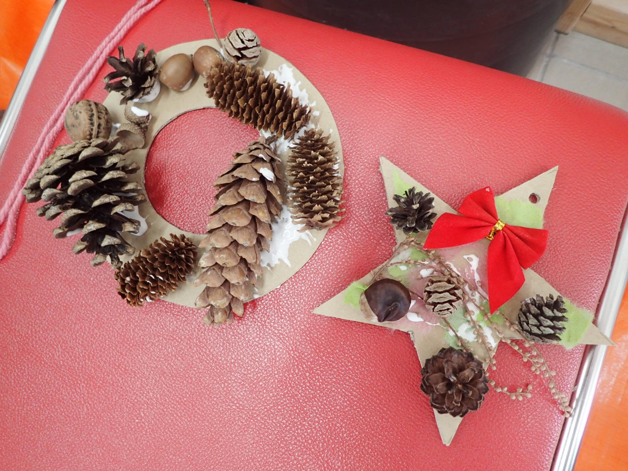 そんなこんなで野外活動を終えて戻ってきたみなさんですが、お次はメインのクリスマス飾りづくりです。お散歩の途中で見つけた落ち葉や木の実をたくさん使って、オリジナルの飾りを作りました♪