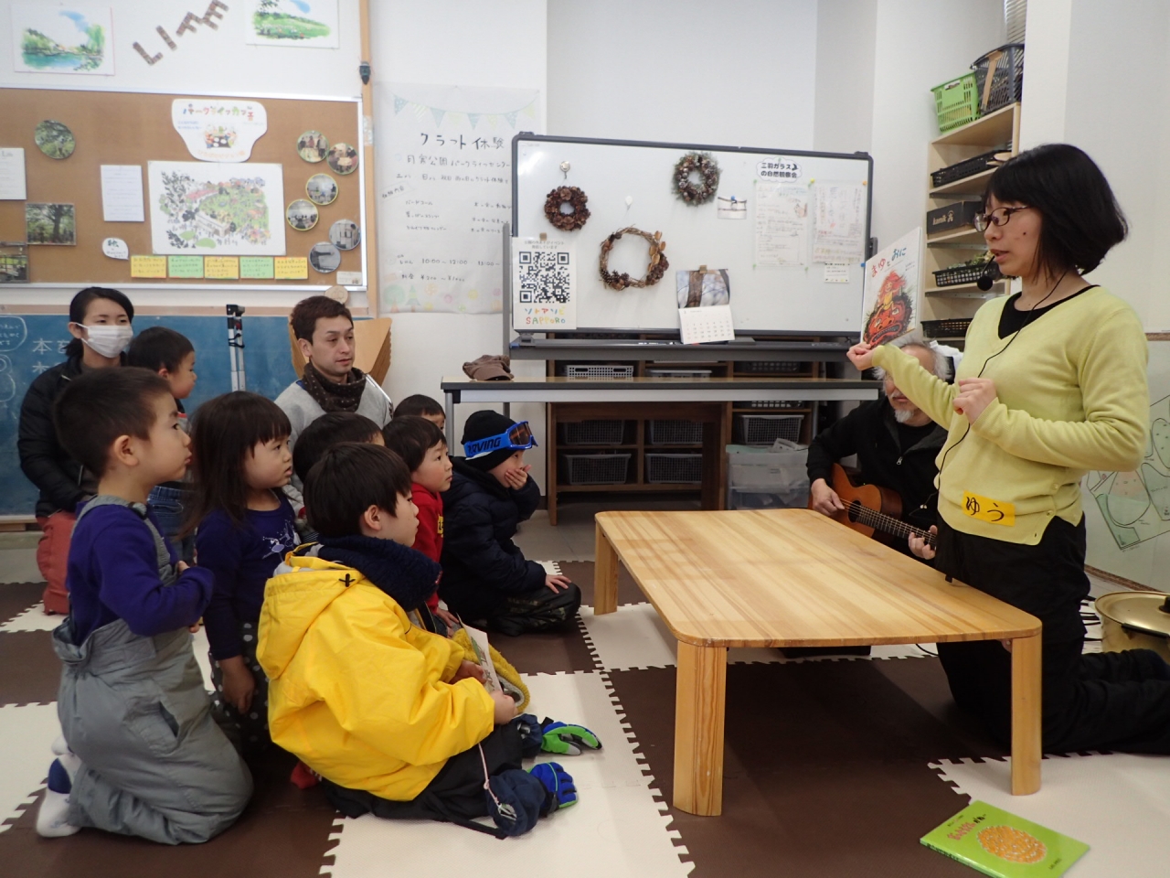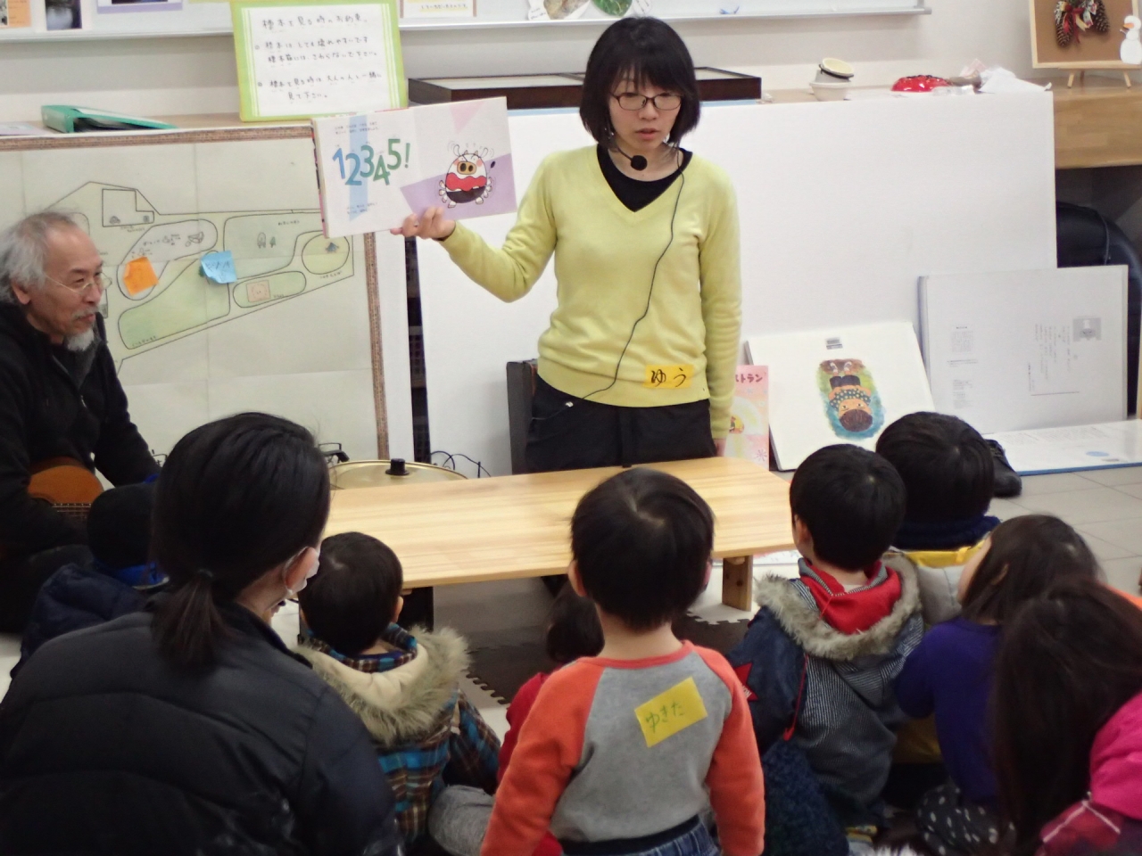 この日は雪が降る予報もあり、最初はパークライフセンターにも人が少なくて心配しましたが、ゆうみつがギターを奏でて絵本を読み始めると、「なんだか楽しそうだぞ?!」とたくさんの子どもたちが集まってきてくれました。