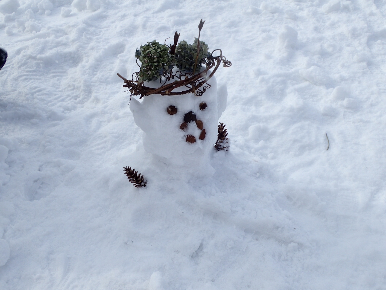 雪玉作り機やバケツ、木の実でかわいい鬼がたくさんできました。