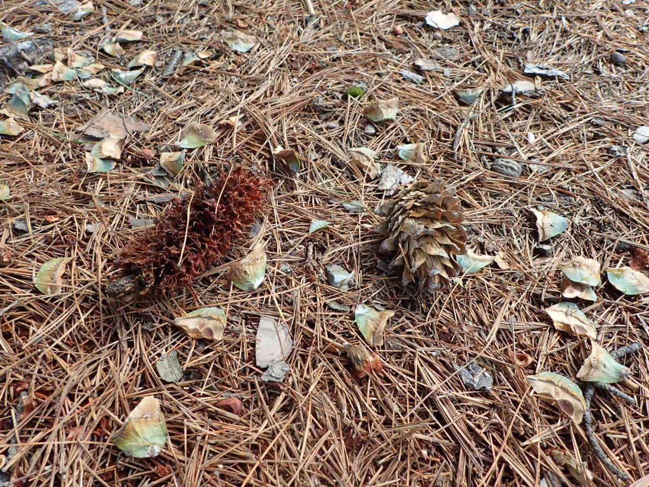 実は、左の松ぼっくりは、エゾリスが食べた痕なんです。チョウセンゴヨウの松ぼっくりの中に入っている松の実は、エゾリスの大好物。ガリガリとエゾリスがおいしく食べた松ぼっくりは、