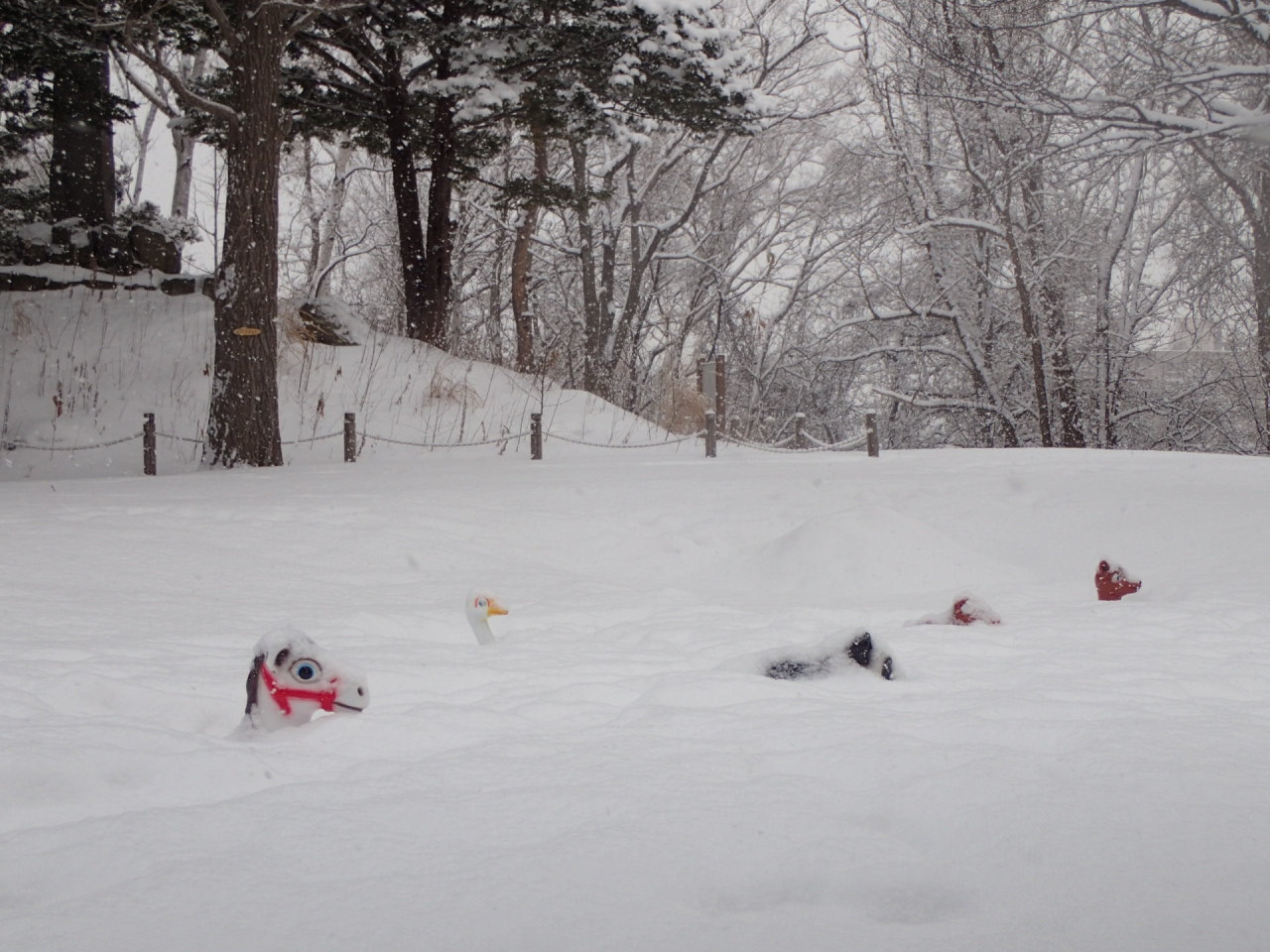 写真は子ども広場の動物遊具です。少しずつ雪に埋まっていっています。