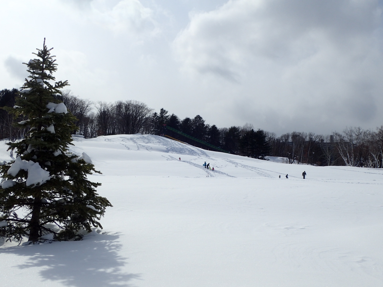 多目的広場も月寒の丘も、一昨日まではそりの跡がたくさん付いていましたが、今日はすっかり雪に覆われています。