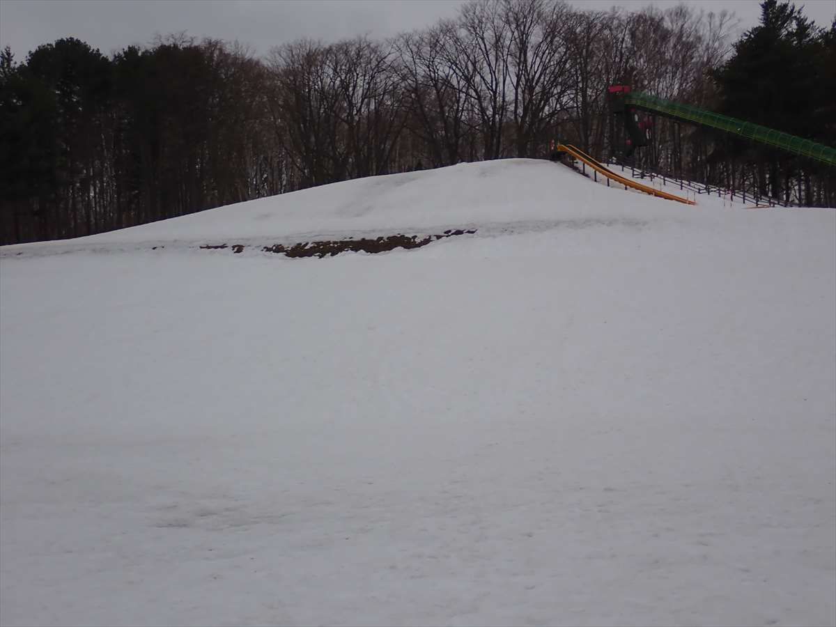 冬の間、そり遊びで大人気だった斜面も、少しずつ地面が見えてきました。