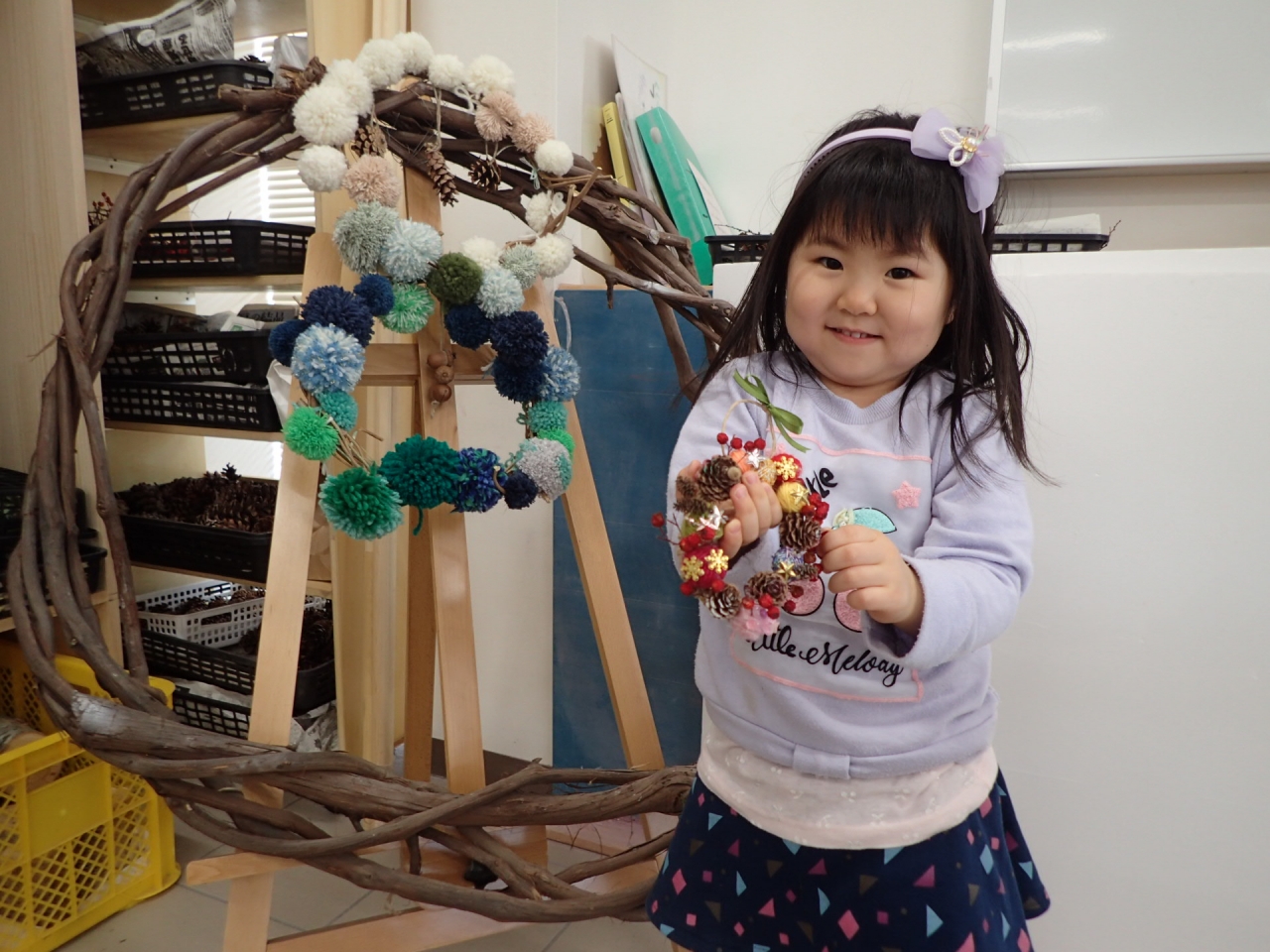 リースにリボンを巻き付けたり、リースの真ん中で毛糸のポンポンがくるくる回るように