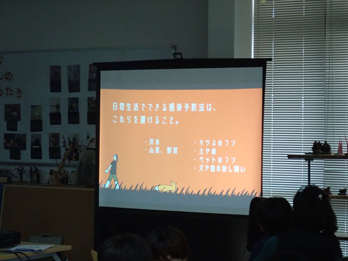 キツネが糞をした時に、この卵が環境にばらまかれ、人がキツネの糞を触ったりすることで、卵が人の体に入り、エキノコックスにかかってしまうことがあるとのことでした。