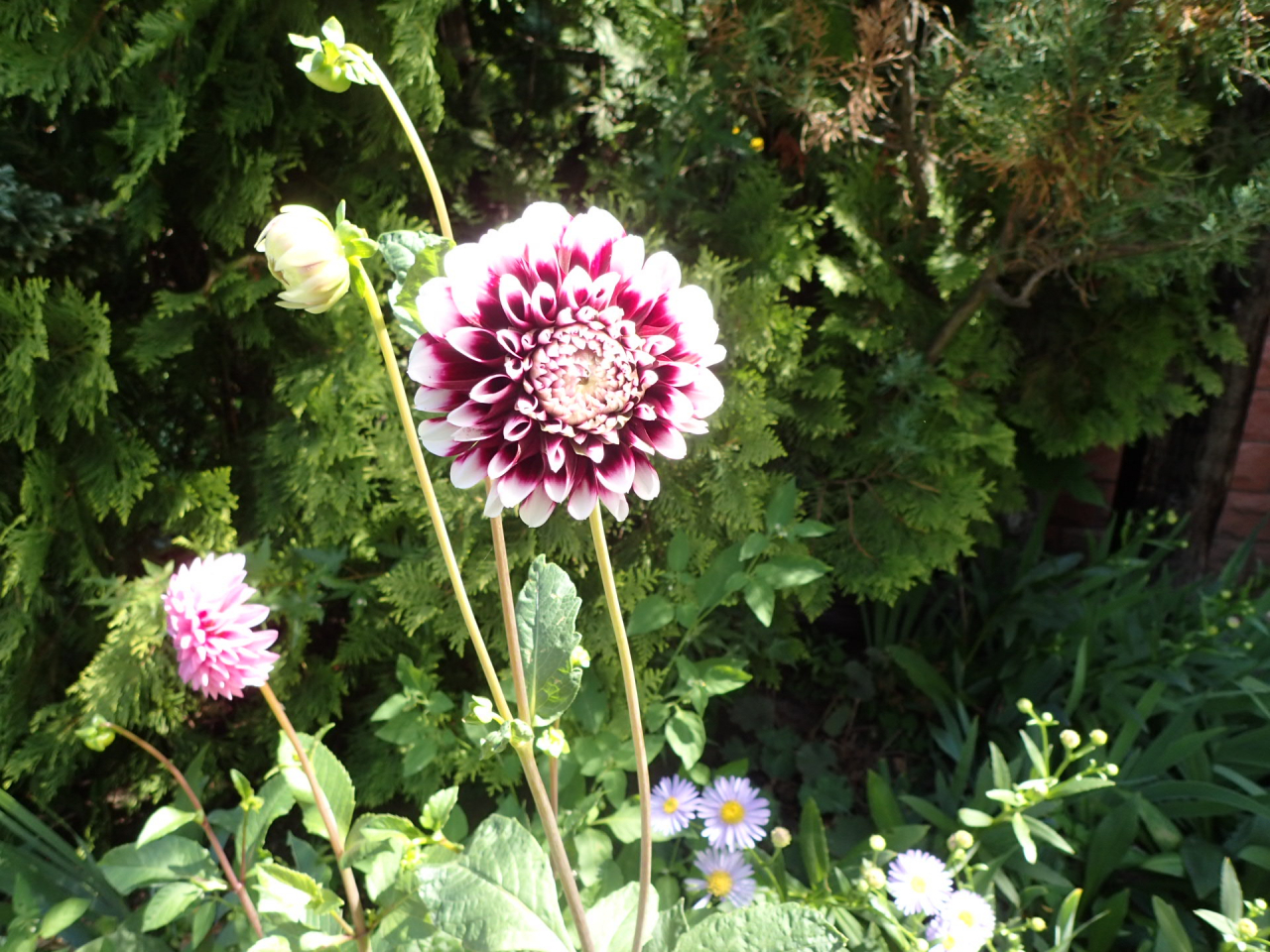 ピンク、赤、白の大輪の花が咲き、見ごたえがあります。