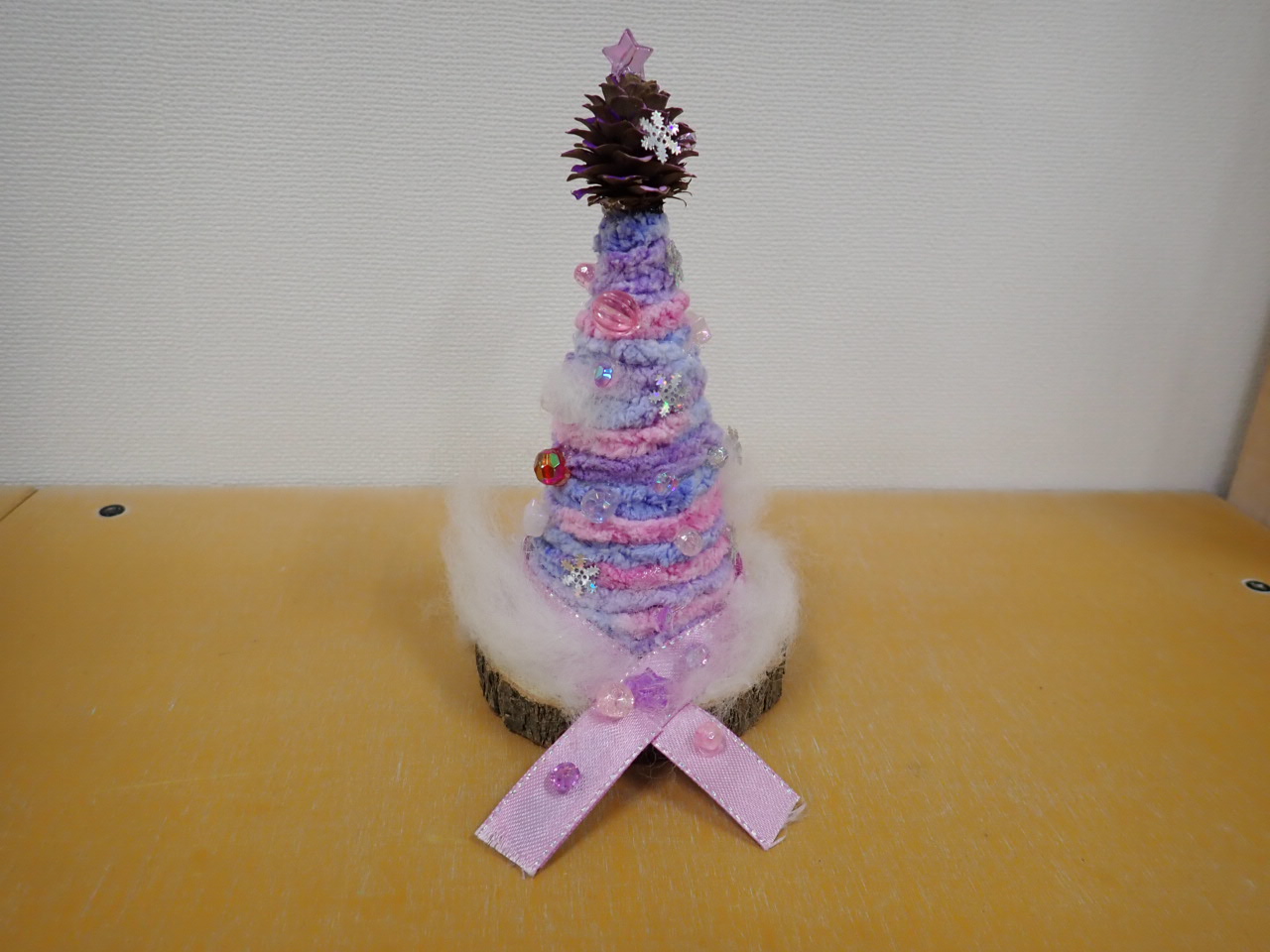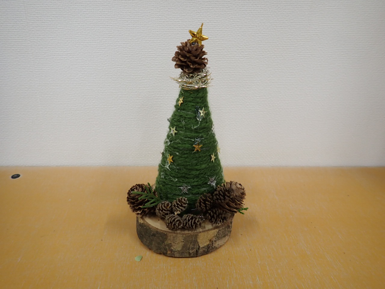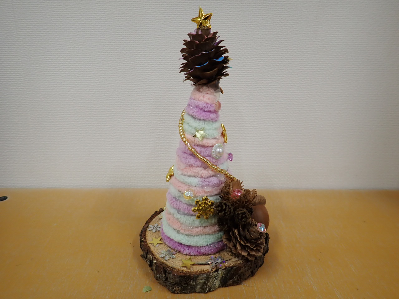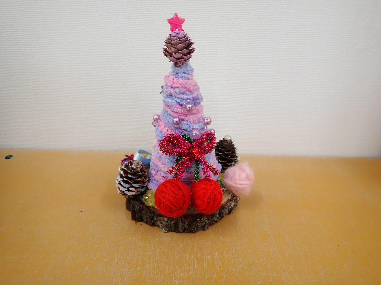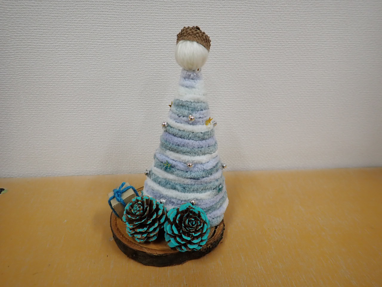 ふわふわの毛糸を巻きつけて、木の実やビーズで作るオリジナルツリー。