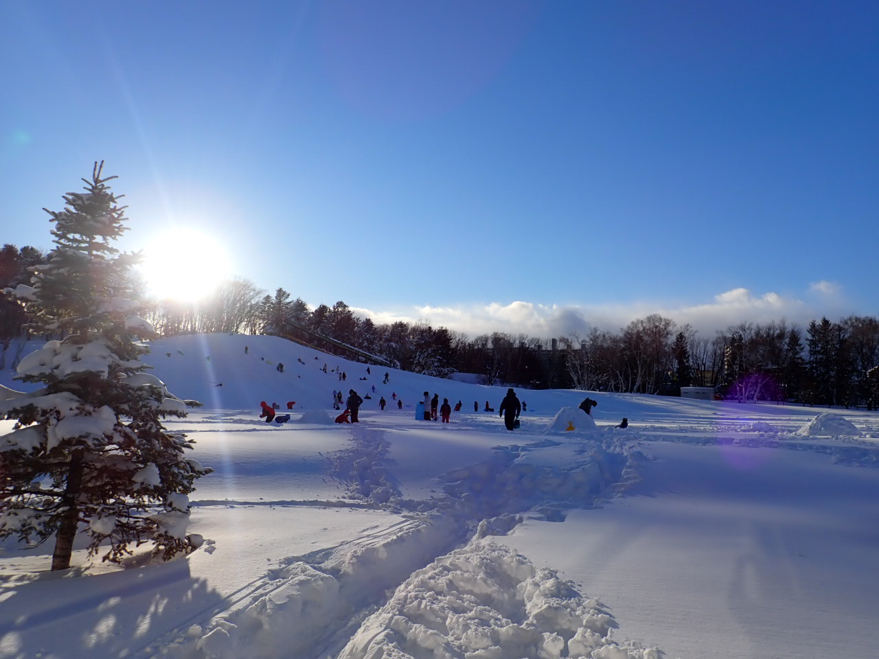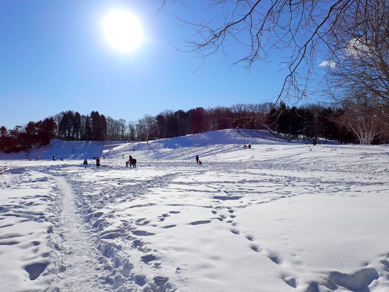 月寒公園はたくさんのそり遊びや雪遊びにきた子ども達でにぎわっています。