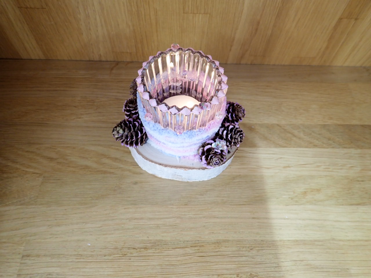 1月の「木の実のキャンドル」は木の輪切りにガラスのキャンドルホルダーをつけて、