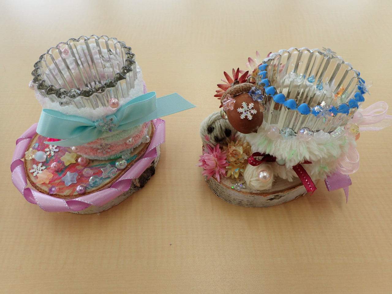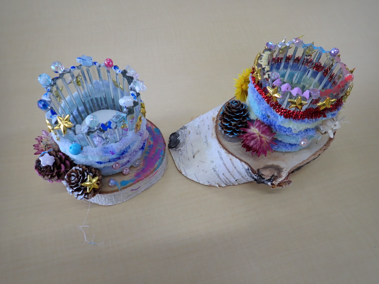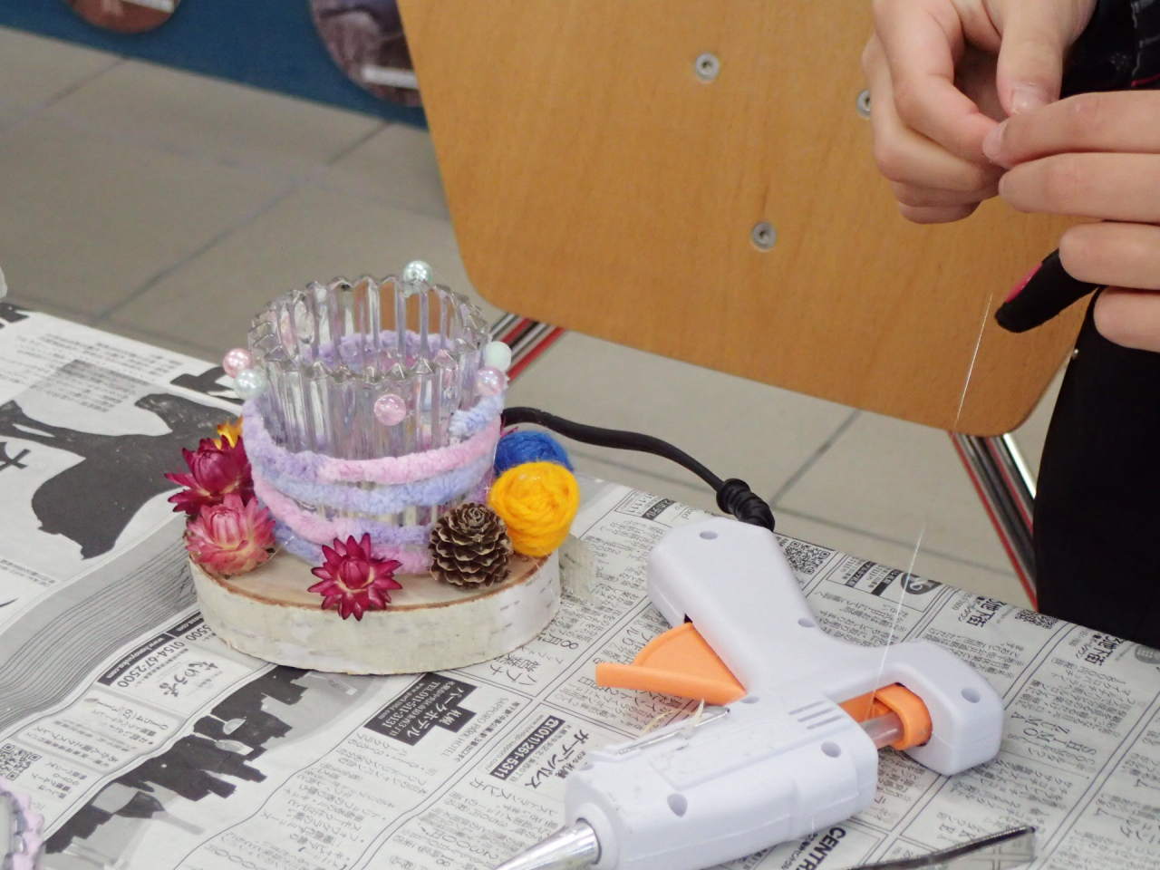 過ごしました。リボンをクルクルしながら貼っていったり、巻きつける毛糸を変えていったり