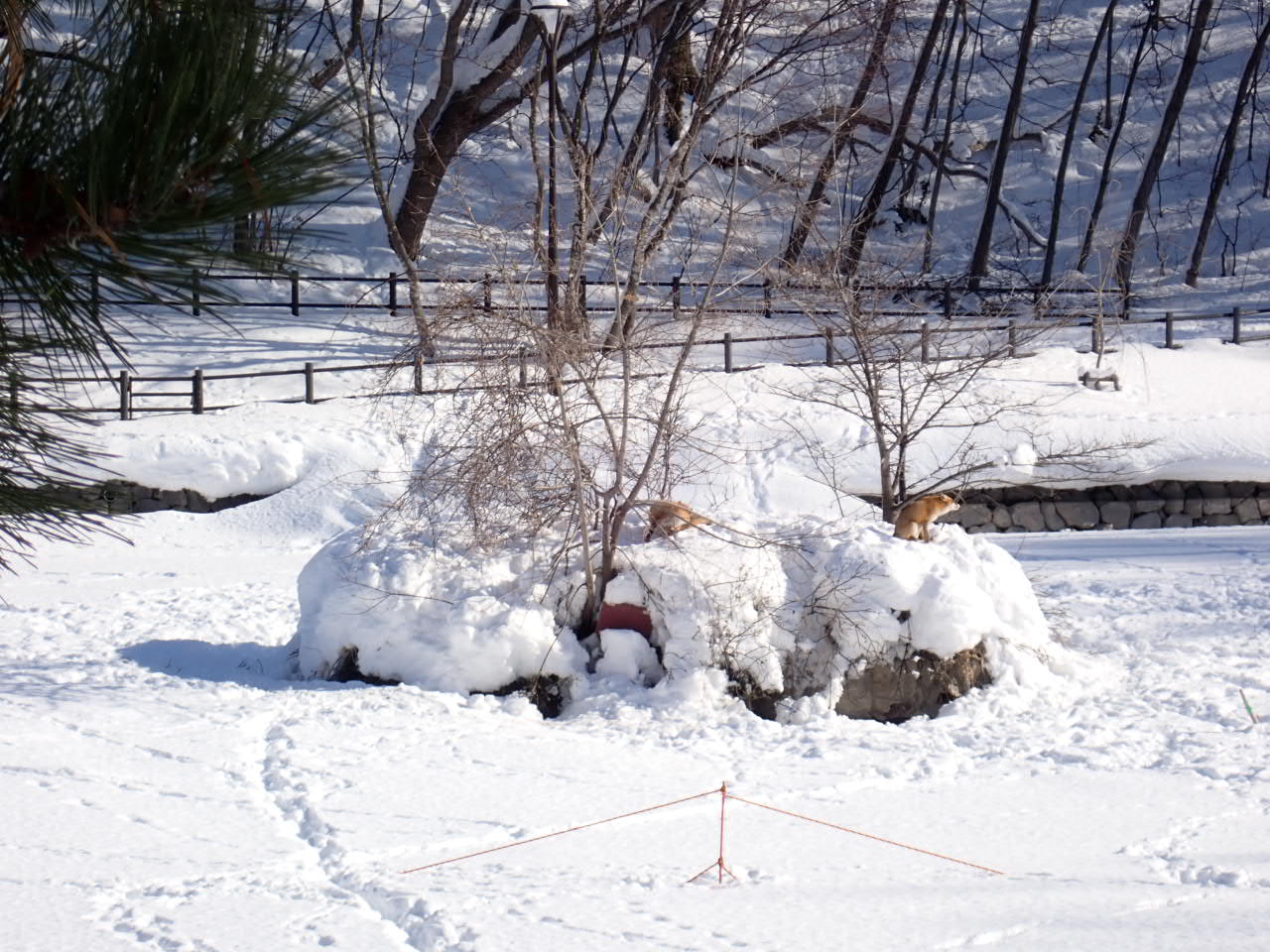 おまけの写真はボート池の浮島にいるキツネです。冬の間しか見られない光景ですね!