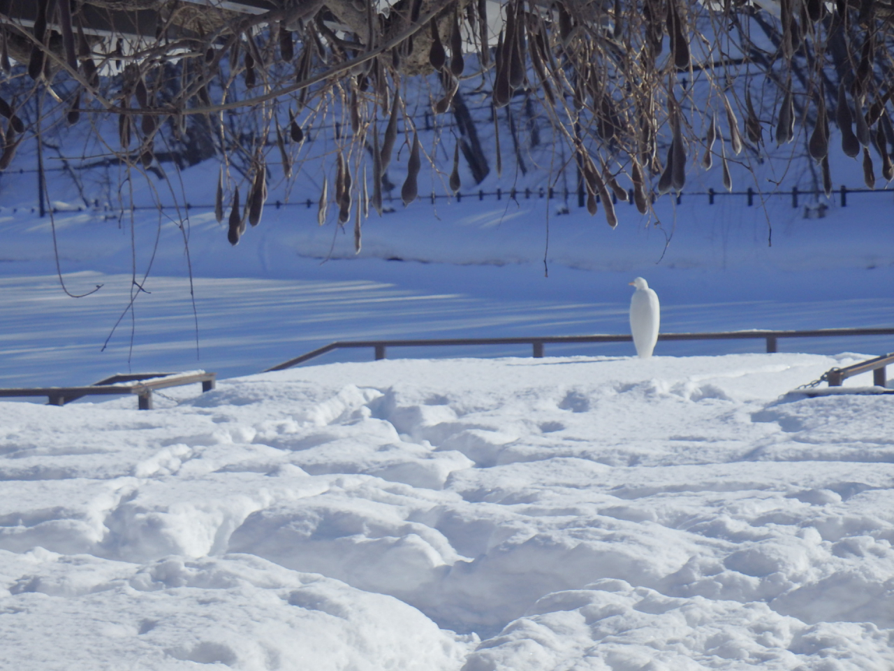ダイサギは、全身真っ白で体長が90㎝程の大型のサギで、図鑑では「夏鳥」と書いてありますが、近年は冬でも札幌市内で見られるようになったようです。