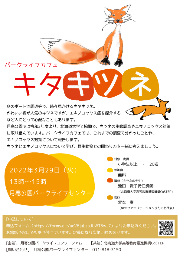 月寒公園のキツネについては、3月29日の「パークライフカフェ キタキツネ」で、北海道大学の池田貴子特任講師が、生態調査の報告をしてくれます。