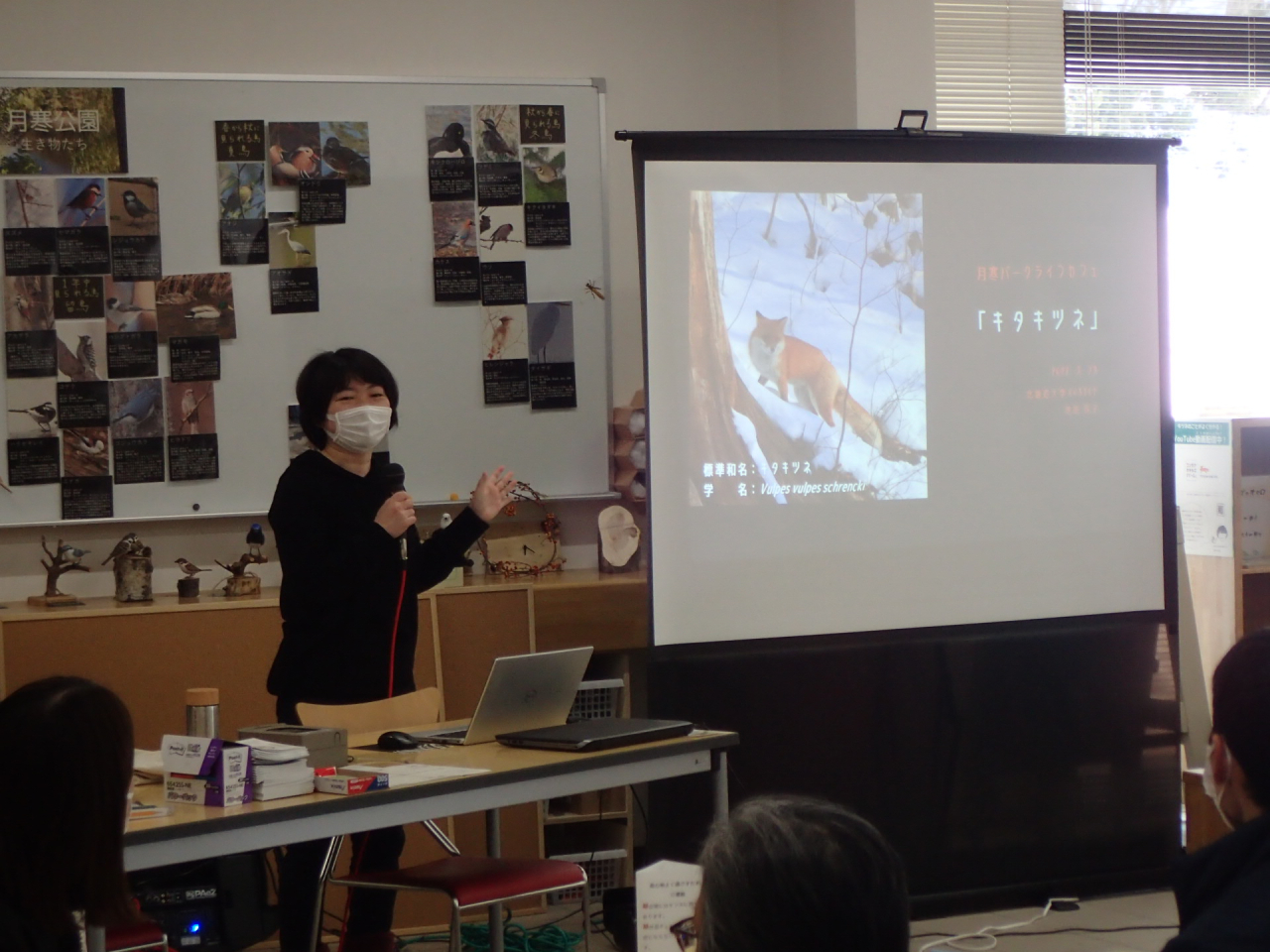 北海道大学高等教育推進機構CoSTEPの池田貴子先生をお招きして、月寒公園にも住んでいるキタキツネの生態やエキノコックス症の仕組みなど、わかりやすく教えてもらいました。