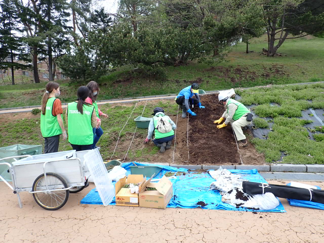 金曜日のシバザクラボランティアは防草シートを張ってシバザクラの植替え作業を