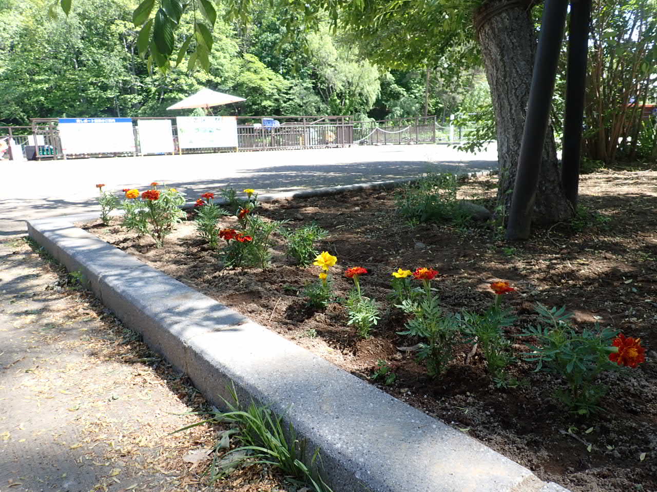 ボート池のシダレザクラと藤棚の下にある花壇にみんなでマリーゴールドの苗を