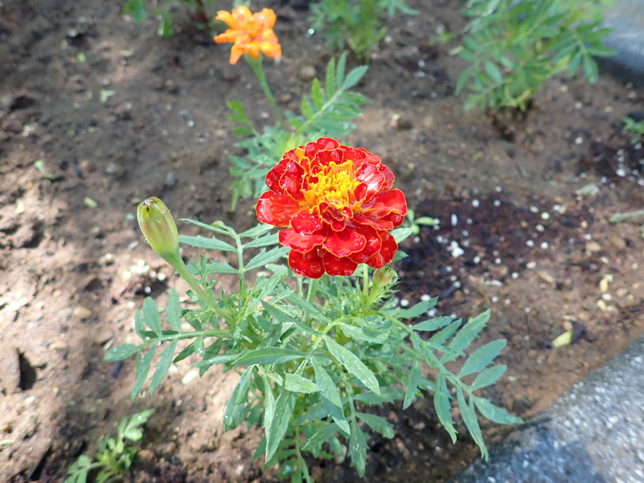 花壇を縁取るように、マリーゴールドを植えました!