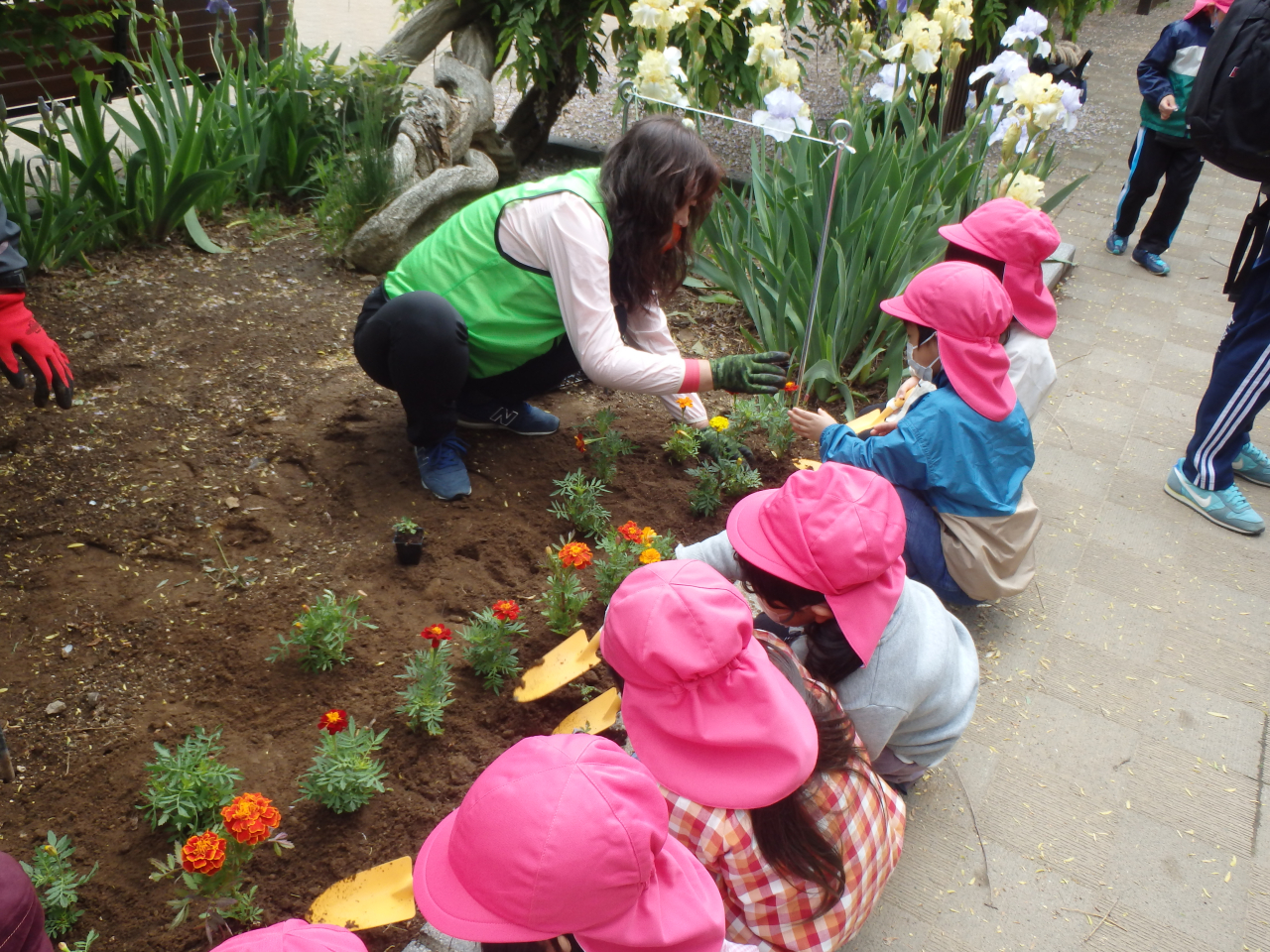 みなさん、上手に植えてくれました。小さな苗も植えたのできっと長い間花壇で