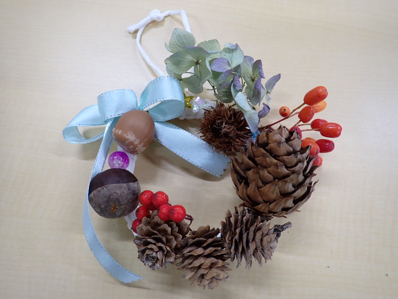 11月は毎年人気の「木の実のリース」です。直径10cm程のミニリースと直径20㎝程の