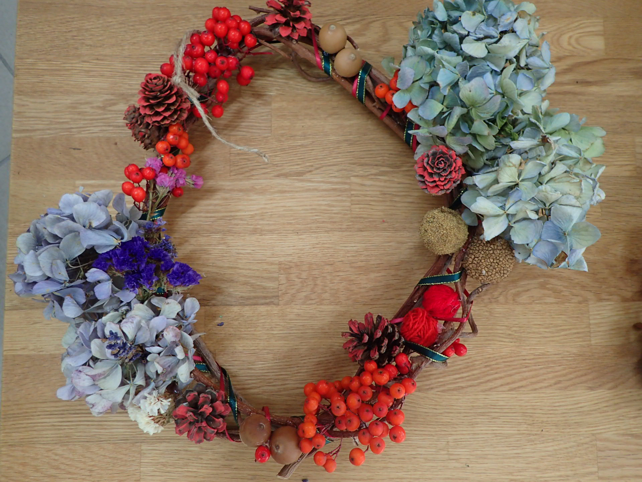 直径20㎝ほどのコクワのツルのリースの枠に木の実やアジサイ、スターチスやリボンで