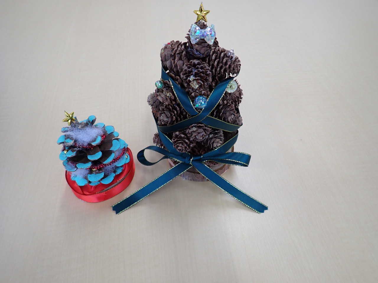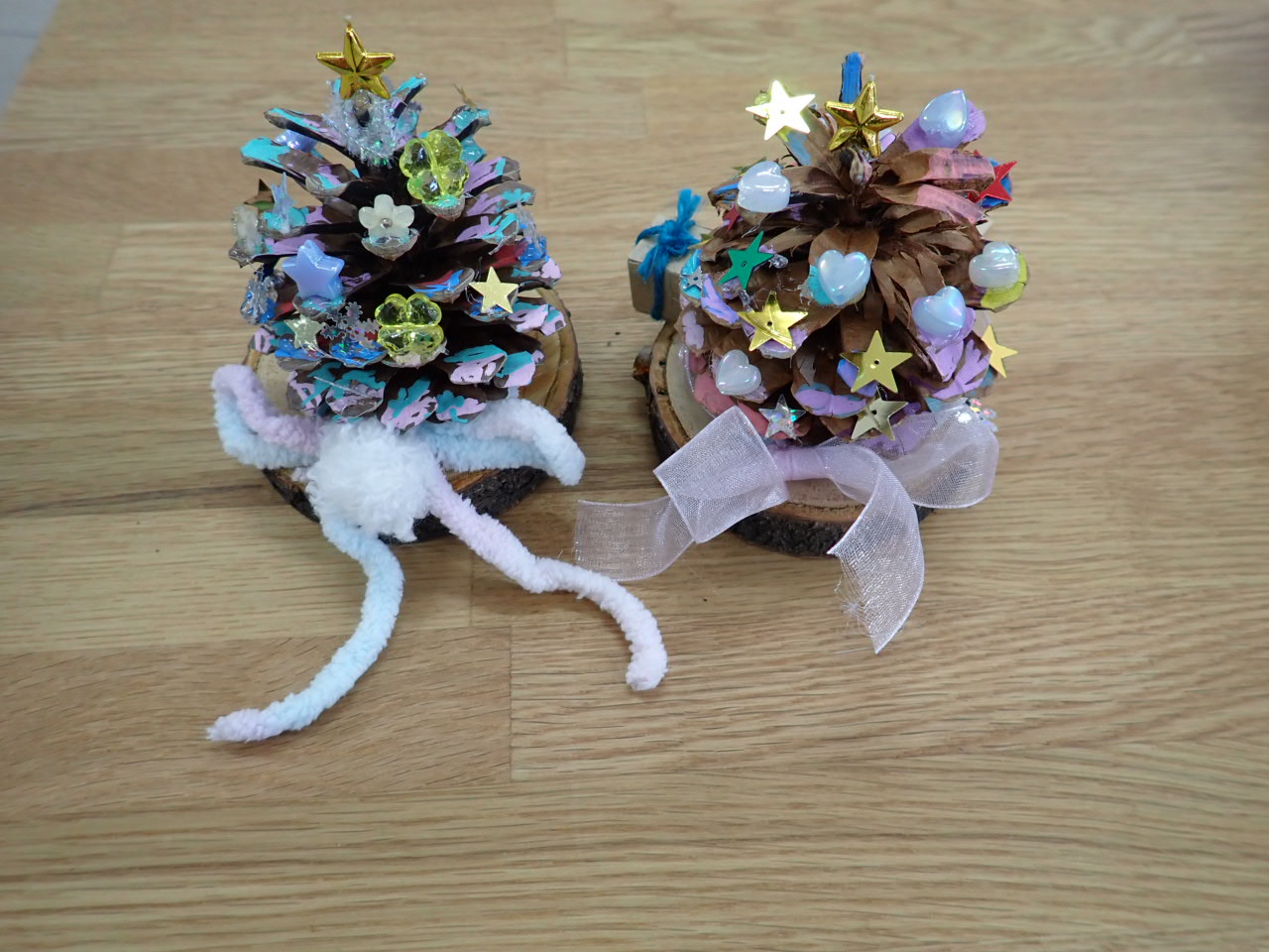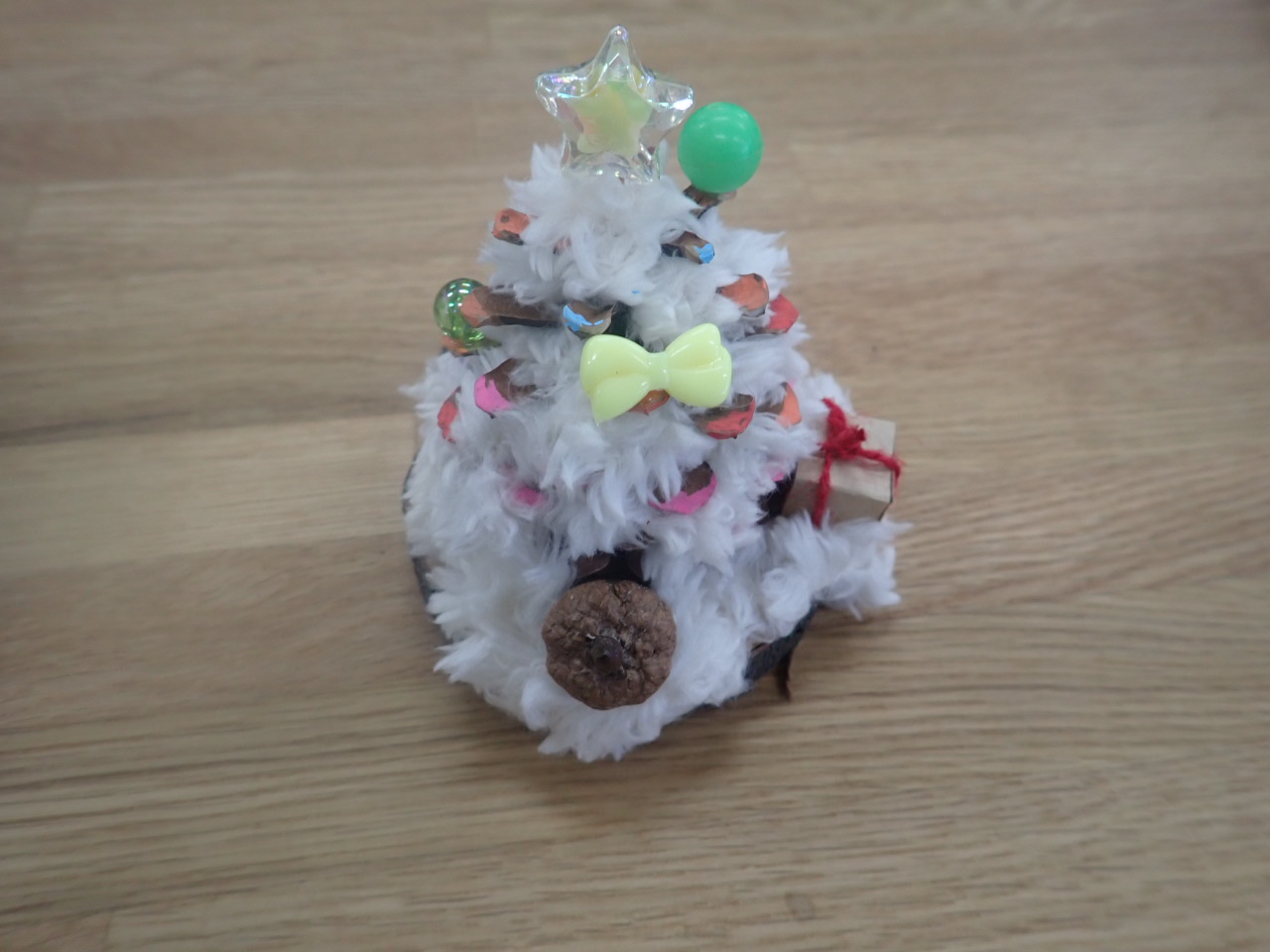 大きなまつぼっくりツリーでした。ポスカで色を塗ってから、毛糸やビーズで飾り付け。