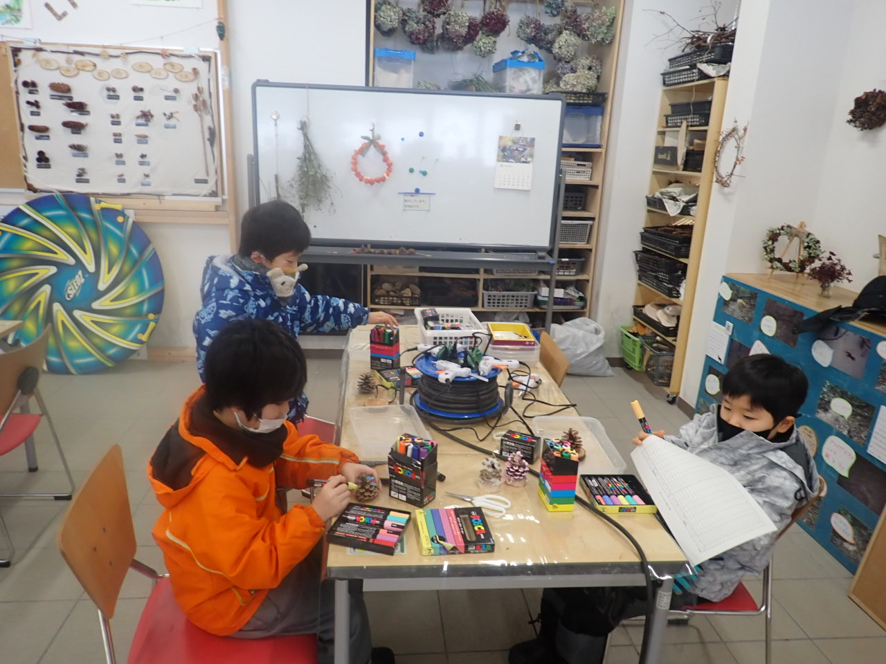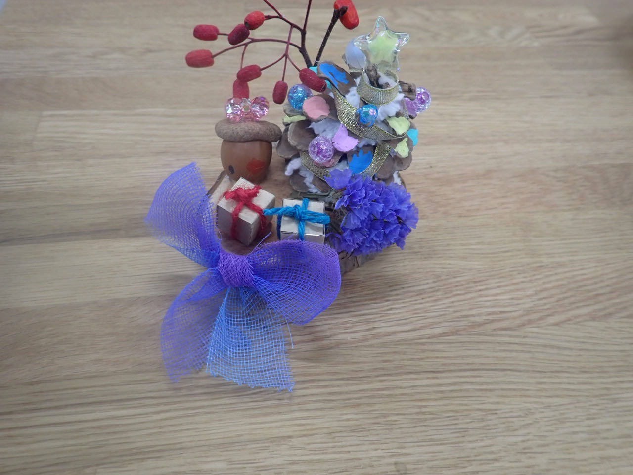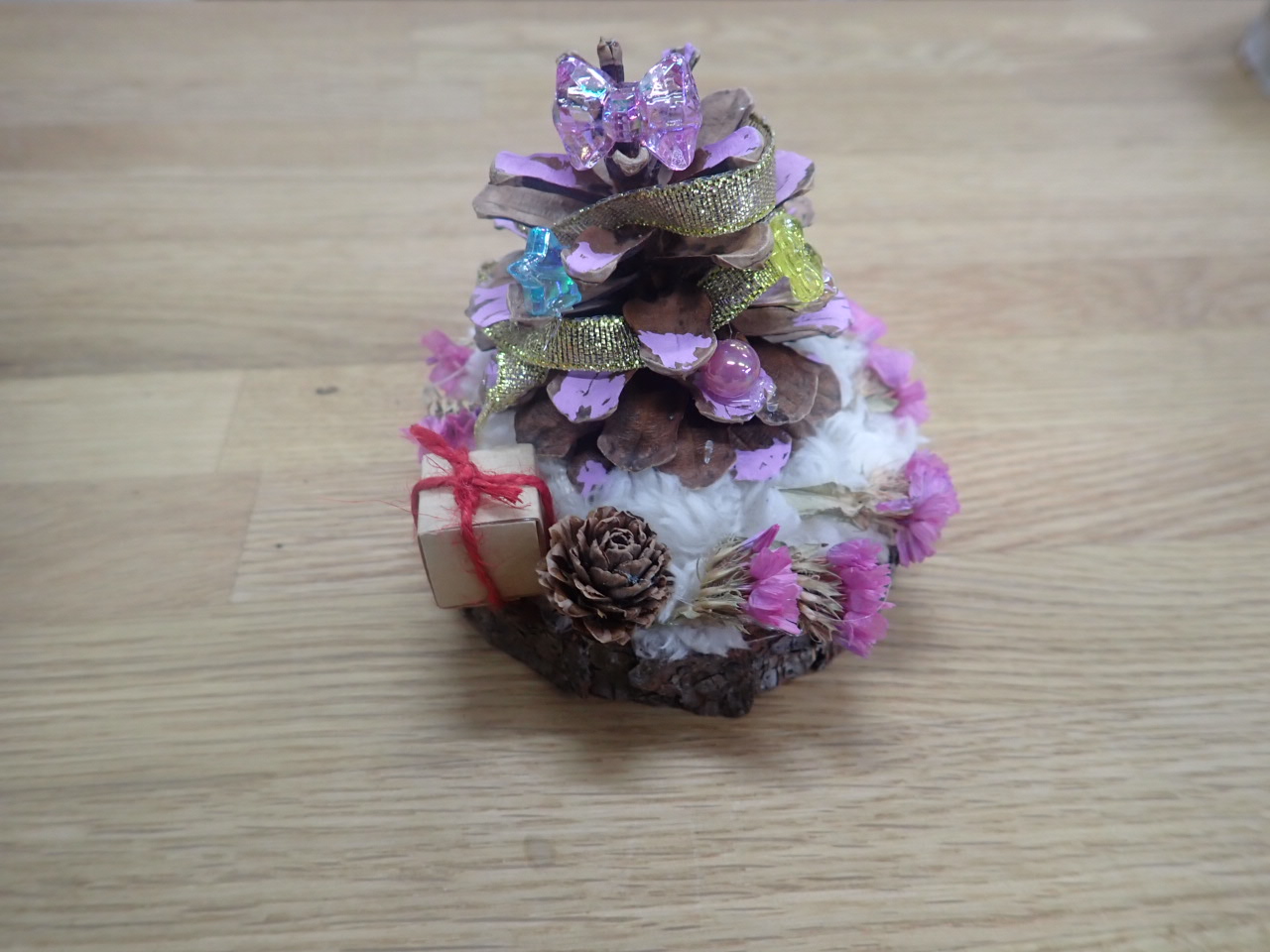 大きなまつぼっくりツリーでした。ポスカで色を塗ってから、毛糸やビーズで飾り付け。