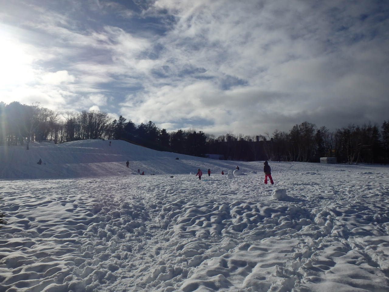 月寒の丘から、多目的広場までの広大な斜面をそりで滑ると、とっても楽しいですが、